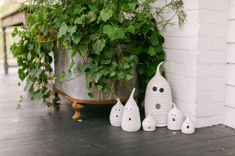 Mollie Jenkins Pottery Ghosts© were originally created in 2013 and have been expanding ever since. These become available once a year and are sold on a first come first serve basis. These MJP Ghosts© are the perfect addition to your Halloween decor. Each Ghost can house a tea-light candle in the back to illuminate the votive at night!