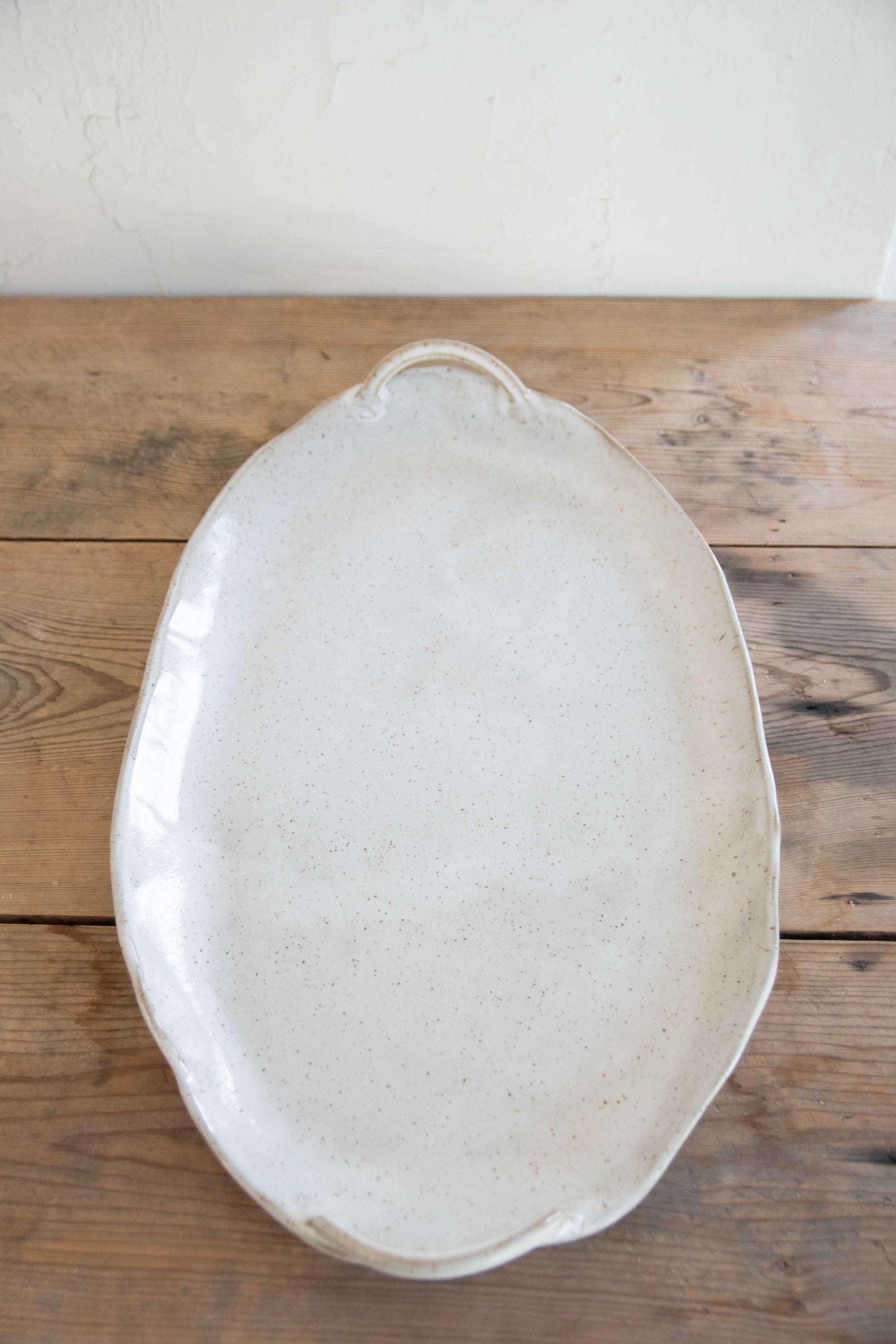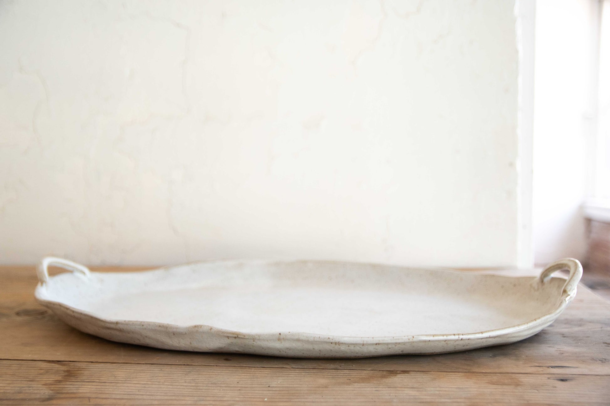 These platters have been made by hand while using a handmade form to hold their shape. All of the platters from this release are then hand glazed with house mixed glazes. This Platter was specifically made for our Curated by Mollie Collection.